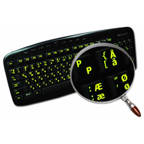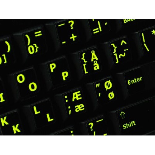 These Danish - English US Glowing keyboard stickers are made of a high quality materials, are durable and efficient. Each sticker is covered with a special protective coat which extremely increases their durability. Danish - English US stickers suitable for variety of keyboard Desktops, Laptops and Notebooks.