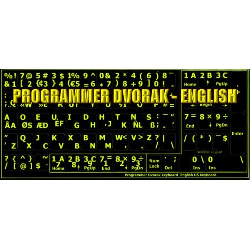 Programmer Dvorak - English US Glowing Fluorescent keyboard stickers are vibrant, bright-colored which are proven to be the best solution to work on your computer even in dim or poorly lit places.
